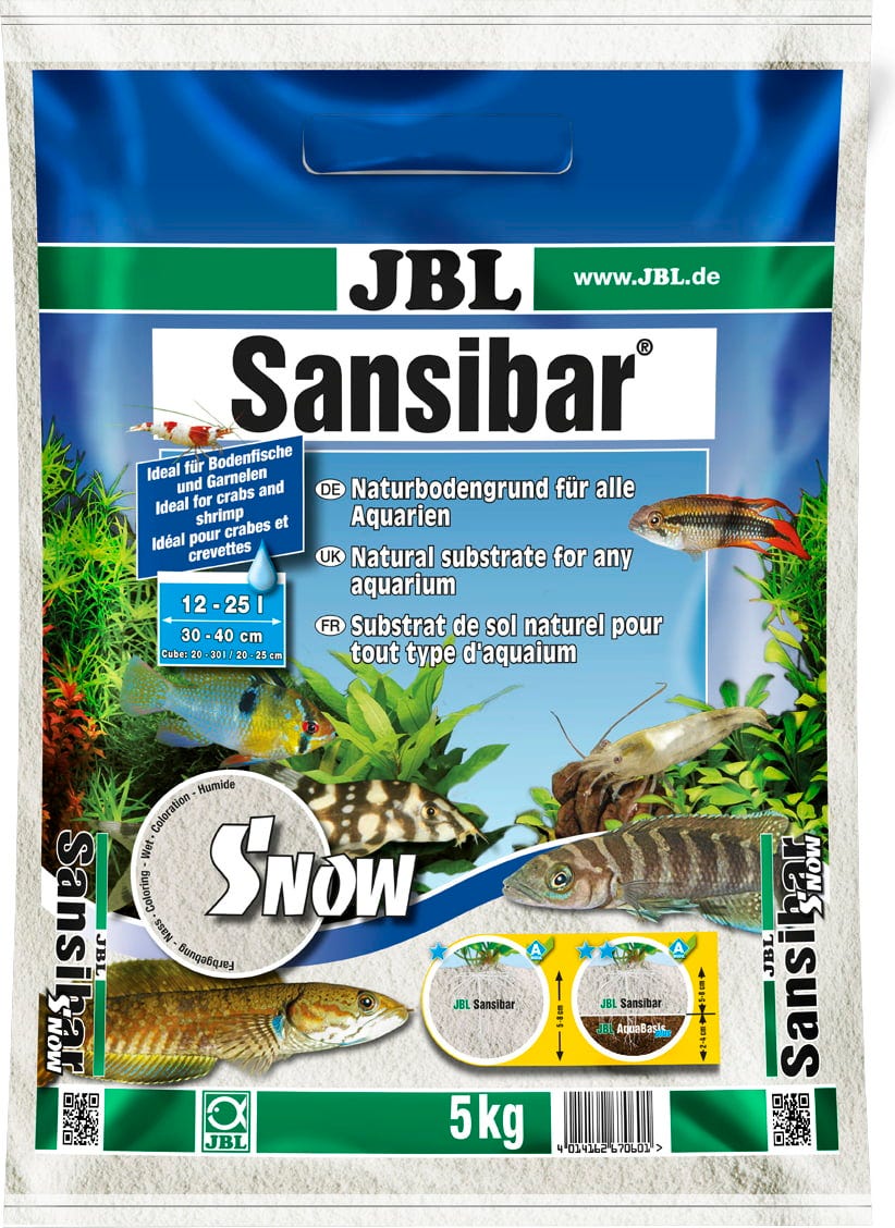 The JBL Zanzibar Snow is a snow-white, very fine sandy soil with a grain size of 0.1-0.6 mm, which is suitable for freshwater and seawater aquariums, as well as for use in the terrarium.
