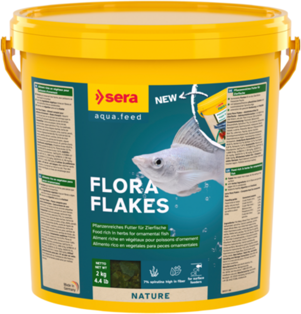 Feed sera Flora Flakes 1-2 times a day in small portions. Feed juvenile fish 3-6 times a day (you can also crumble the flakes and sprinkle them on the water surface). Feed only as much as the fish can consume in a few minutes. Any food remains visible after an hour should be suctioned up and discarded. Reduce the amount of food at the next feeding accordingly. Once opened, keep the jar tightly closed to preserve freshness and use it up within a few months.